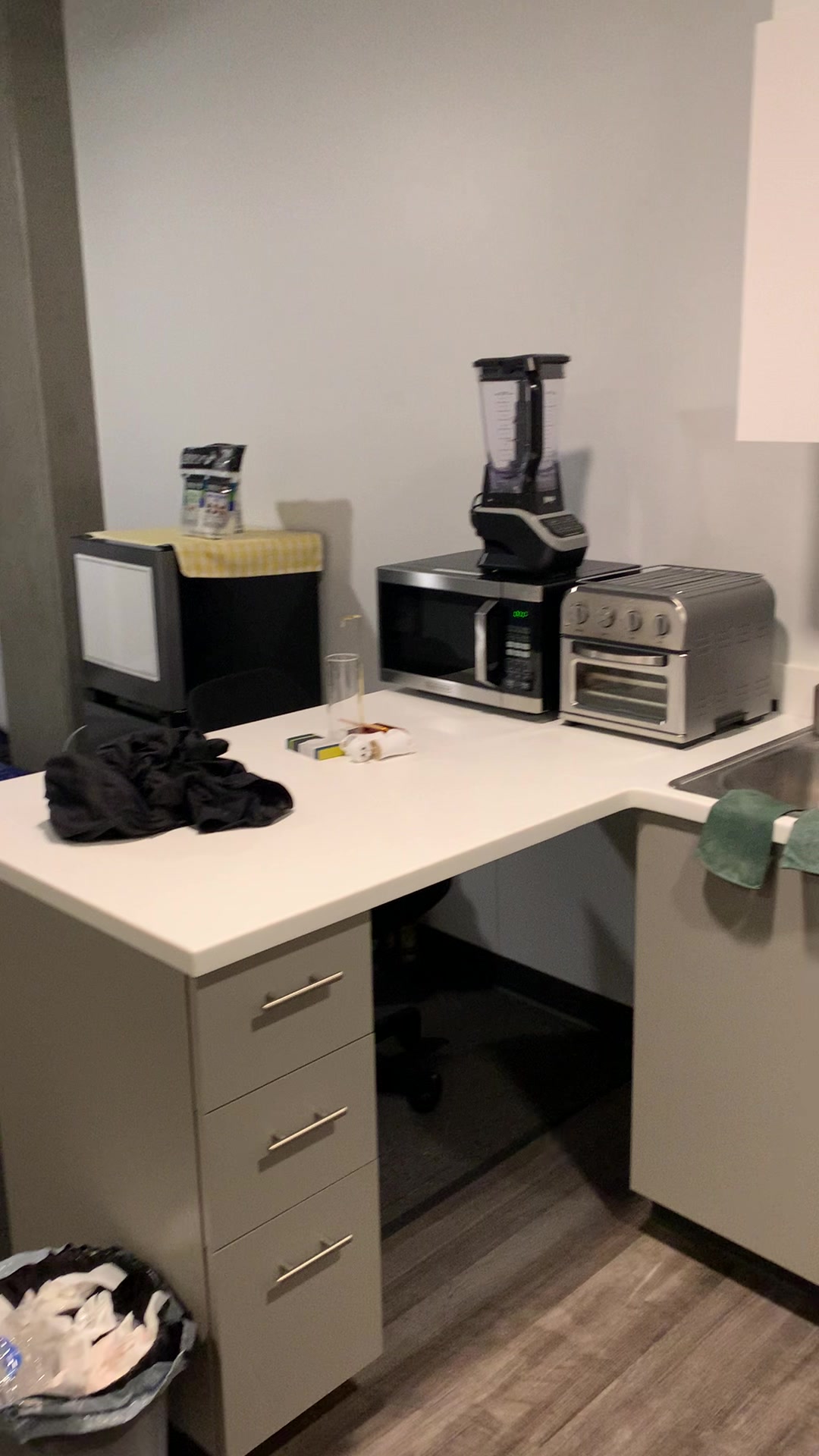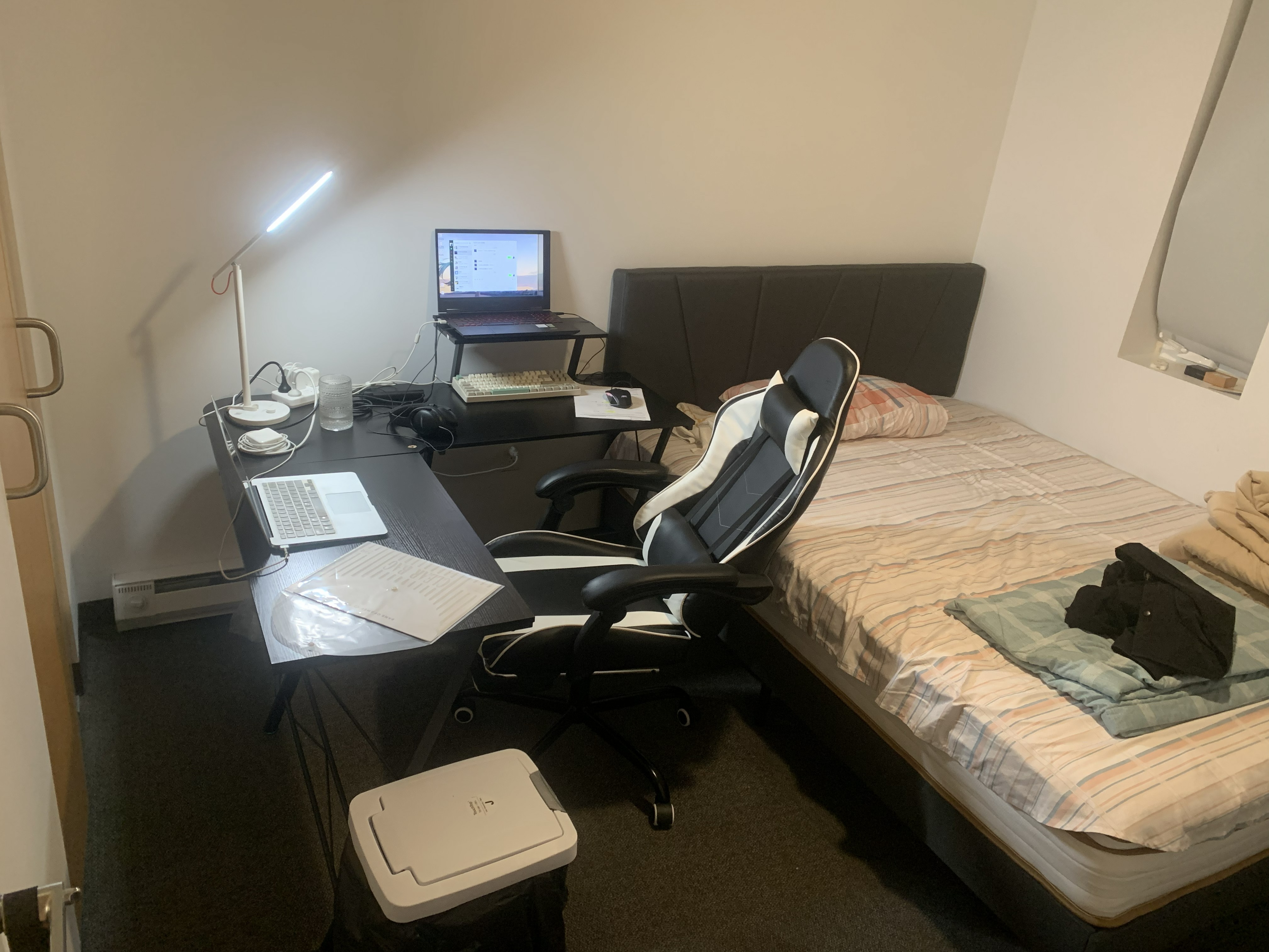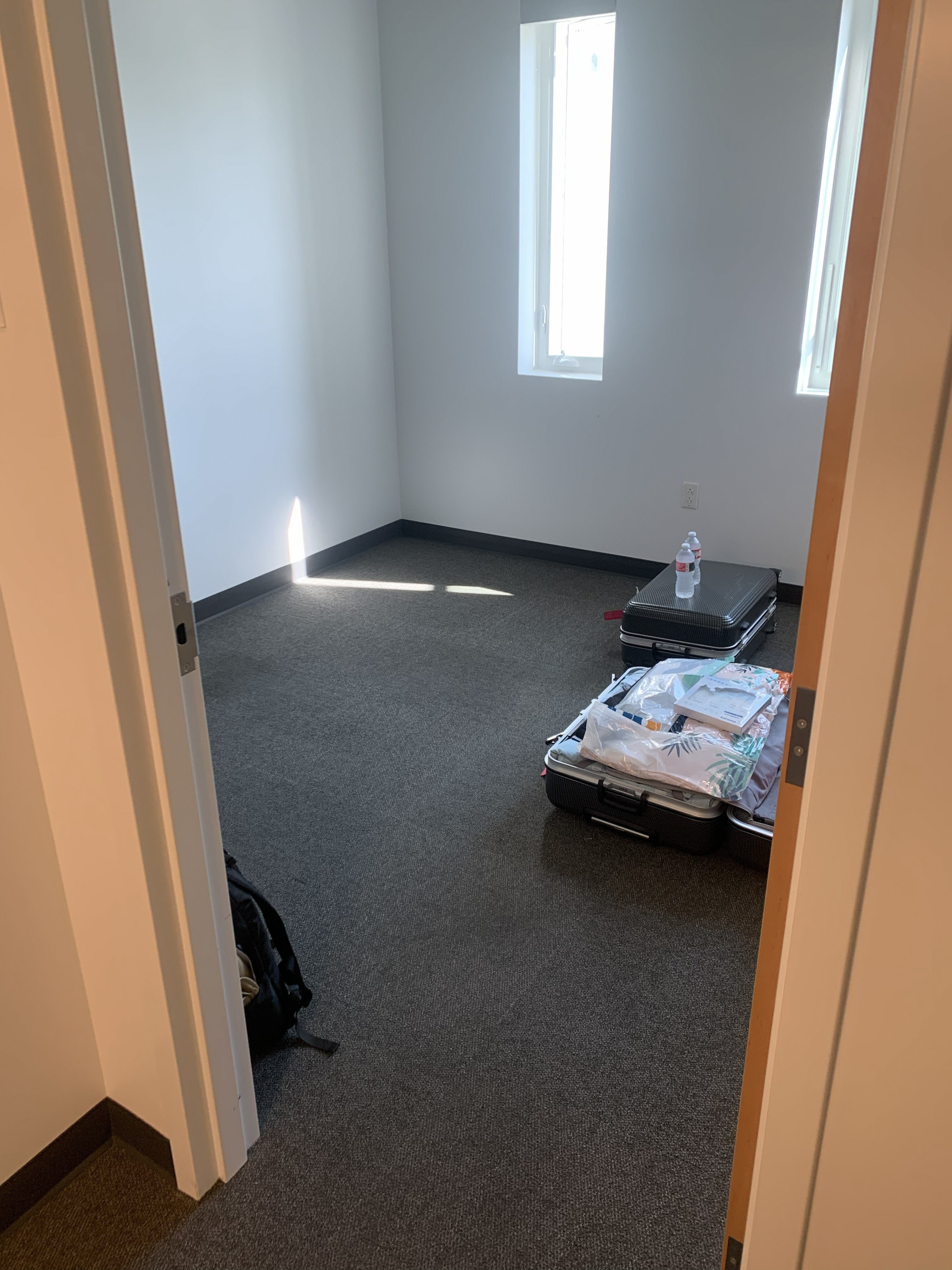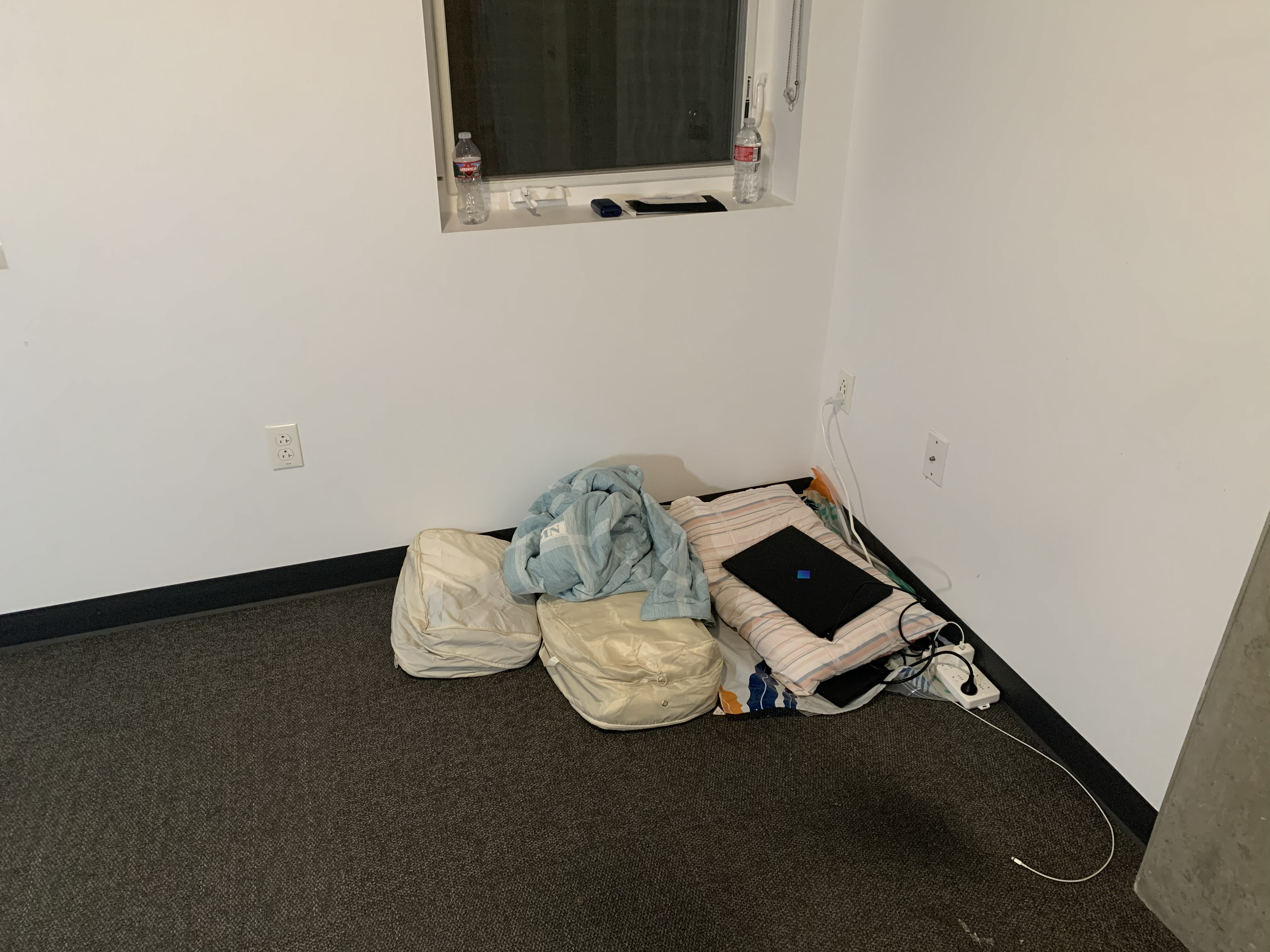 我住的是研究生宿舍,不带家具,因此刚到的时候卧室里面空无一物。我的室友是非常友好的韩国人(未来还会提到他很多次),比我提前两个月入住,因此他基本置办了客厅餐厅卫生间洗漱间的大部分东西。 由于买的床要过两天才到,因此把打包的衣服垫着打了几天地铺。我现在还记得当时睡着有多难受……